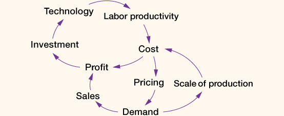 Today's economies are structured with self-reinforcing feedback loops in which profits and labor productivity continue to increase. For example, technology boosts labor productivity, cost reduction from the saved effort to leads to greater profit, profit leads to investment, and investment lead to further technological development, which increases labor productivity. Similarly, if costs decline, prices can also be reduced, which increases demand, which increases sales and profits. This is another self-reinforcing feedback loop. Next, if demand increases, the scale of production will increase, which reduces costs, which reduces prices, which increases demand, creating another self reinforcing feedback loop. With a number of interlinked feedback loops like these, the economy continues to grow.