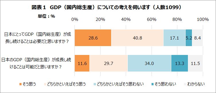 この結果から、GDPの成長を「必要」と考える人は約7割に達するものの、「可能」と考える人は約4割にとどまり、「必要だと思うが、実現可能ではないのではないか」という意識があることが浮き彫りになりました(図表1)。